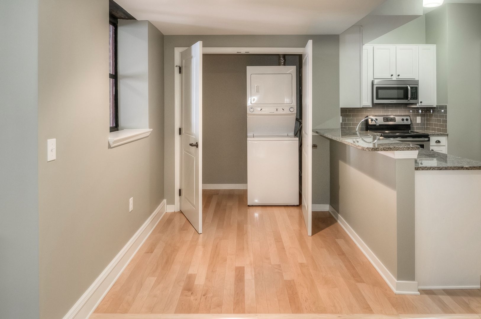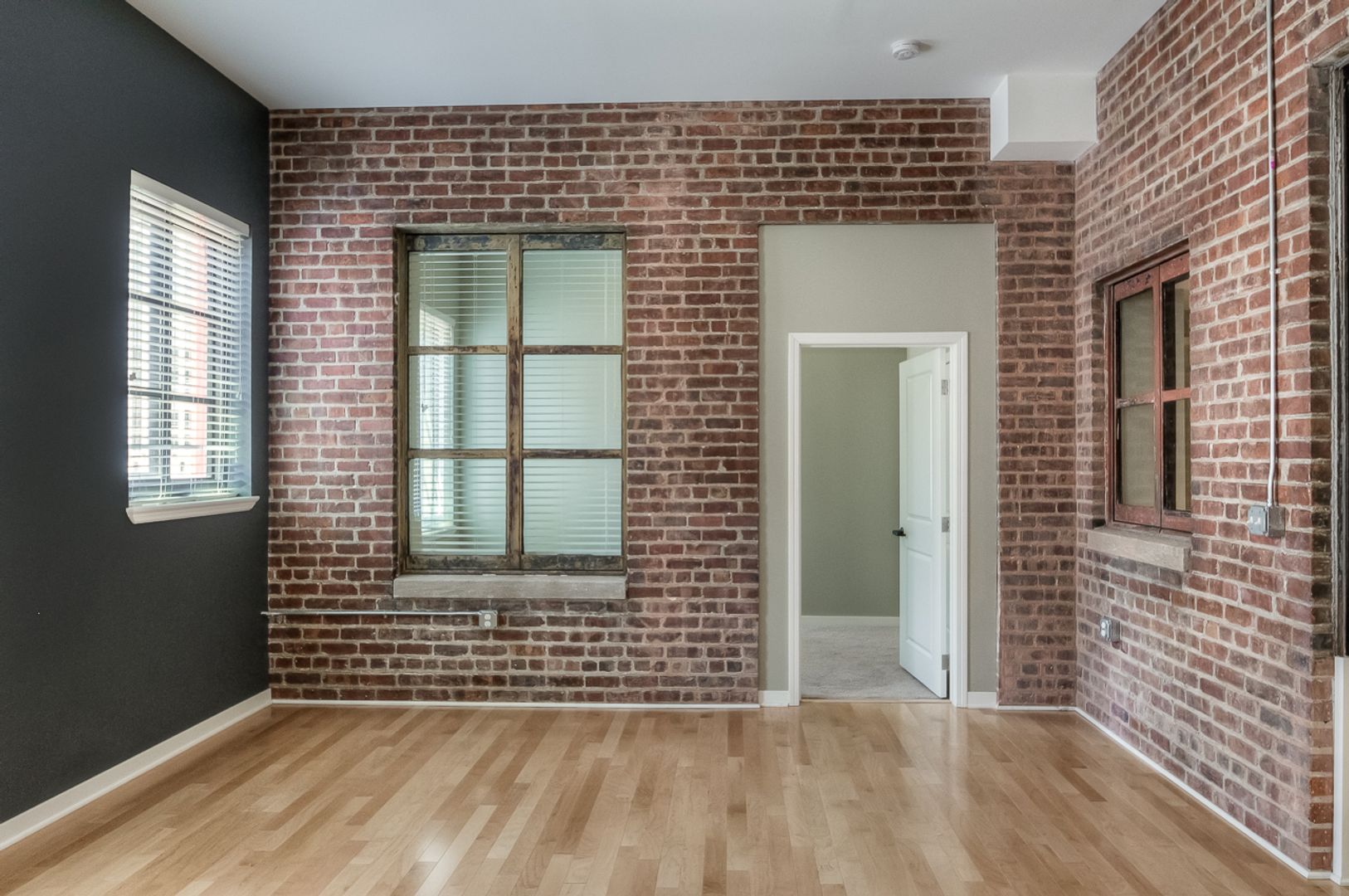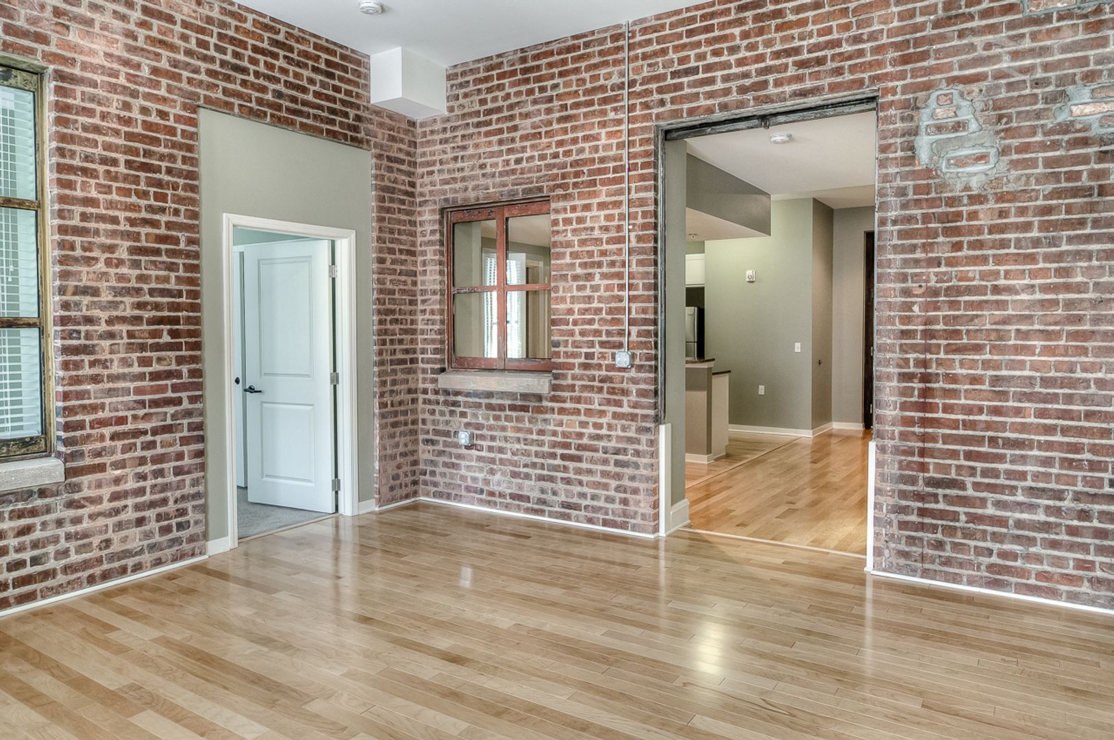 Inside, the apartment blends exposed brick character with modern finishes. Enjoy open living areas with hardwood floors, a fully equipped kitchen with stainless steel appliances, granite countertops, and plenty of cabinet space. Each home includes two full bathrooms, in-unit washer and dryer, spacious closets, and thoughtful details throughout.