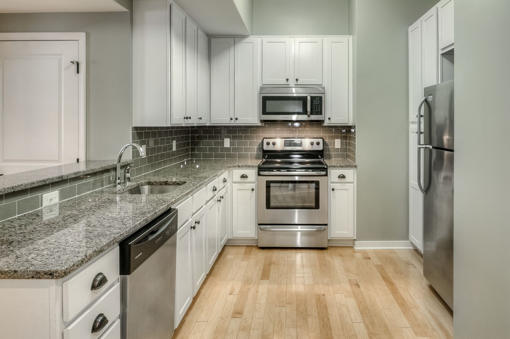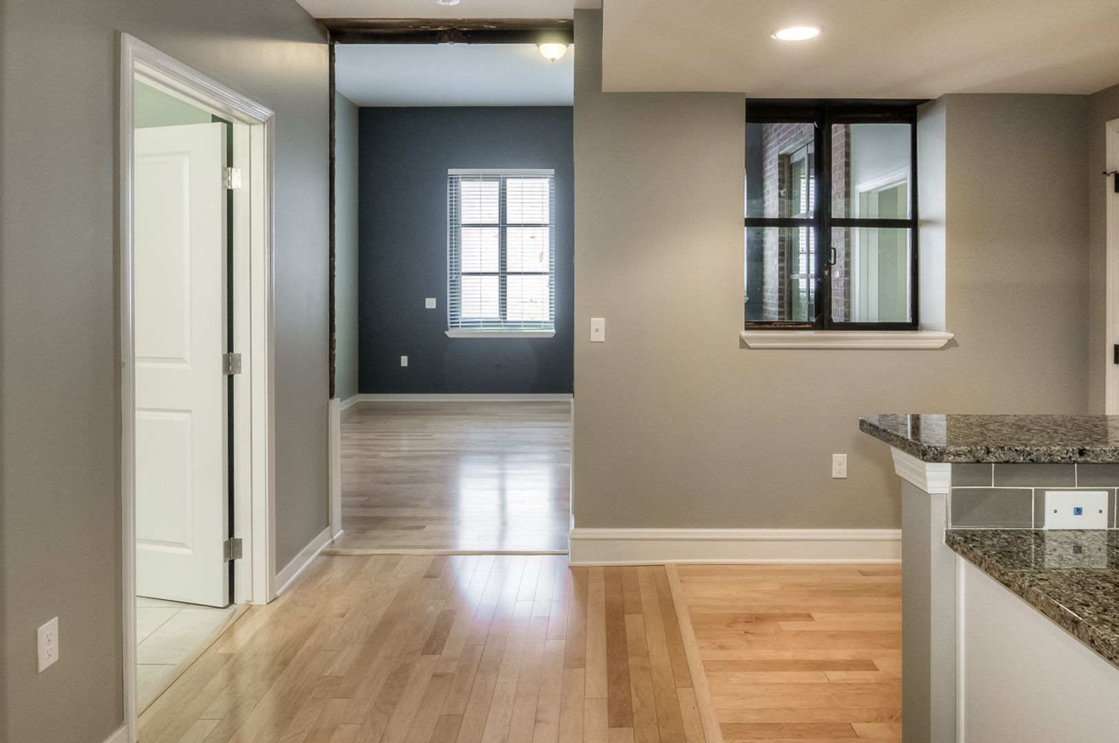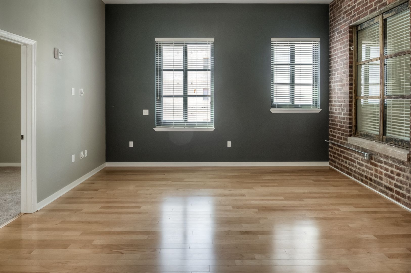 Inside, the apartment blends exposed brick character with modern finishes. Enjoy open living areas with hardwood floors, a fully equipped kitchen with stainless steel appliances, granite countertops, and plenty of cabinet space. Each home includes two full bathrooms, in-unit washer and dryer, spacious closets, and thoughtful details throughout.