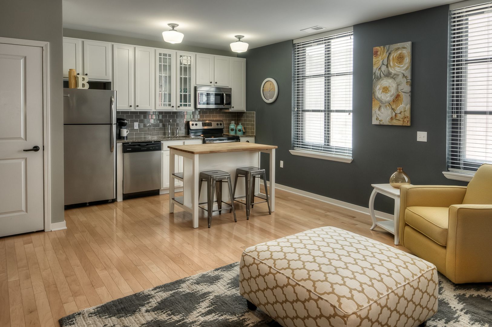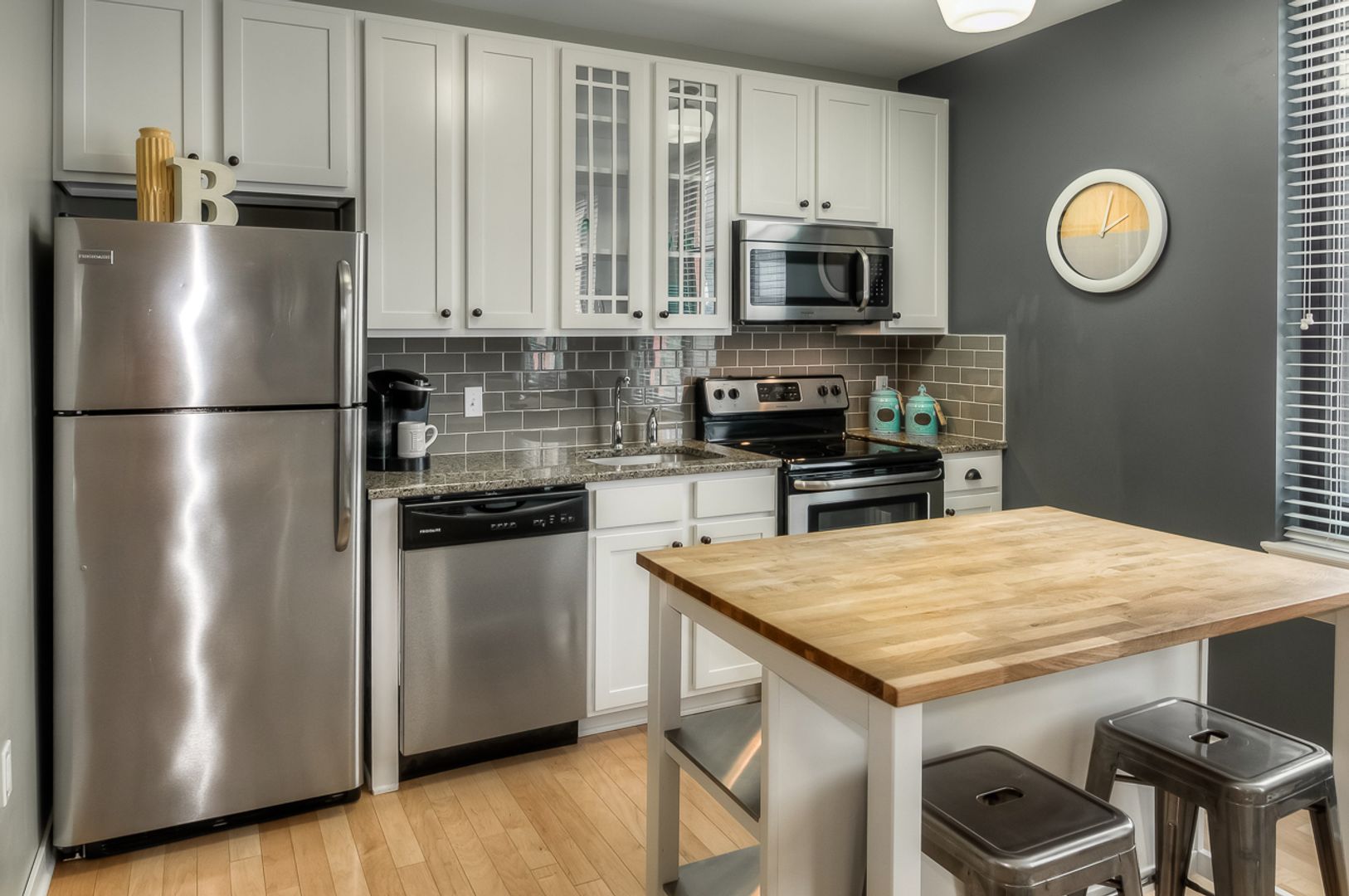 The Mike at The Barker offers 888 square feet of thoughtfully designed living space in a beautifully restored historic building in Omaha’s Central Business District. This one-bedroom apartment features hardwood floors, oversized windows, and an open layout filled with natural light. The kitchen includes stainless steel appliances, granite countertops, and abundant storage, while the bedroom and bath provide comfort and privacy.